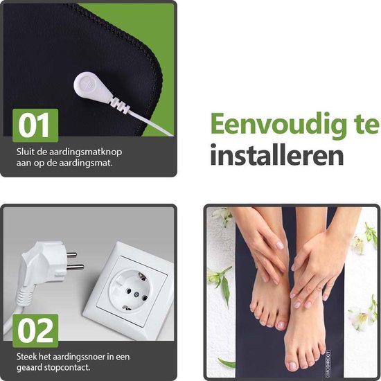 Verbind de mat via de meegeleverde 4,6 meter lange kabel met een geaard stopcontact. Plaats je blote voeten of armen op de mat — kleding tussen huid en mat vermijden voor optimale geleiding.